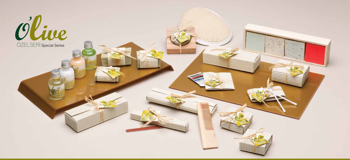 1.Zeytinyağlı Şampuan 2.Zeytinyağlı Vücut Losyonu 3.Zeytinyağlı Saç Kremi 4.Zeytinyağlı Vücut Şampuanı 5.Zeytinyağlı Sabun (30gr.) 6.Zeytinyağlı Sabun (50gr.) 7.Zeytinyağlı Sabun (70gr.) 8.Diş Seti 9.Zeytinyağlı Sabun Aşap Sabunluklu (30gr.) 10.Banyo Lifi 11.Sabun Seti Ahşap Kutuda 12.Tıraş Seti 13.Ayakkabı Cilası 14.Dikiş Seti 15.Kulak Pamuğu 16.Tarak 17.Törpü 18.Makyaj Pamuğu 19.Duş Bonesi 20.Buklet Tepsi 21.Buklet Tepsi
