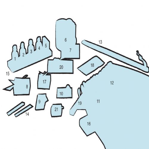 1.Saç Kremi 2.Şampuan 3.Duş Jeli 4.Vücut Losyonu 5.Sabun 6.Banyo Lifi 7.Ponza Taşı 8.Ayakkabı Cilası 9.Kulak Pamuğu 10.Dikiş Seti 11.Traş Seti 12.Çamaşır Torbası 13.Çekecek 14.Şeker 15.Ahşap Buklet Tepsi 16.Duş Bonesi 17.Makyaj Pamuğu 18.Kese 19.Törpü 20.Diş Seti 21.Sabun